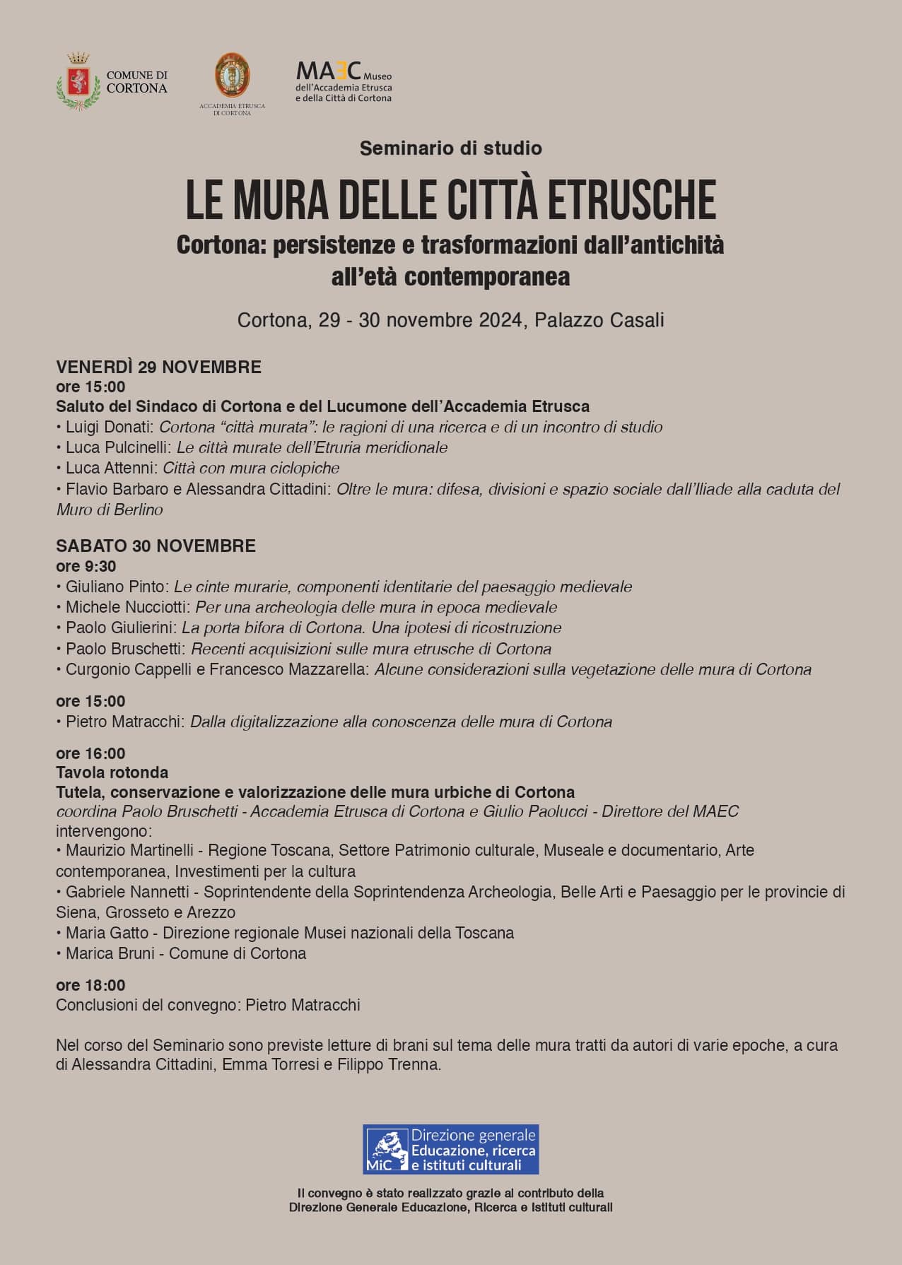 L’ Accademia Etrusca di Cortona, in collaborazione con il Comune di Cortona, organizza per le giornate di venerdì 29 (ore 15-18) e sabato 30 novembre (ore 9.30-18.30) un seminario di studi dal titolo “Le mura delle città etrusche. Cortona: persistenze e trasformazioni dall’antichità all’età contemporanea” al quale parteciperanno studiosi di varie discipline con l’intento di illustrare lo stato attuale delle conoscenze sulle mura e di proporne la valorizzazione nel quadro complessivo della promozione del Parco Archeologico della città. L’iniziativa giunge al termine di una serie di indagini e studi condotti dall’Accademia Etrusca, con la supervisione della Soprintendenza e in stretta collaborazione con il Dipartimento di Architettura dell’Università di Firenze, in particolare con il Prof. Pietro Matracchi, e si concluderà con una tavola rotonda destinata a individuare le forme migliori di tutela e di fruizione delle mura cittadine, anche sul piano turistico.
